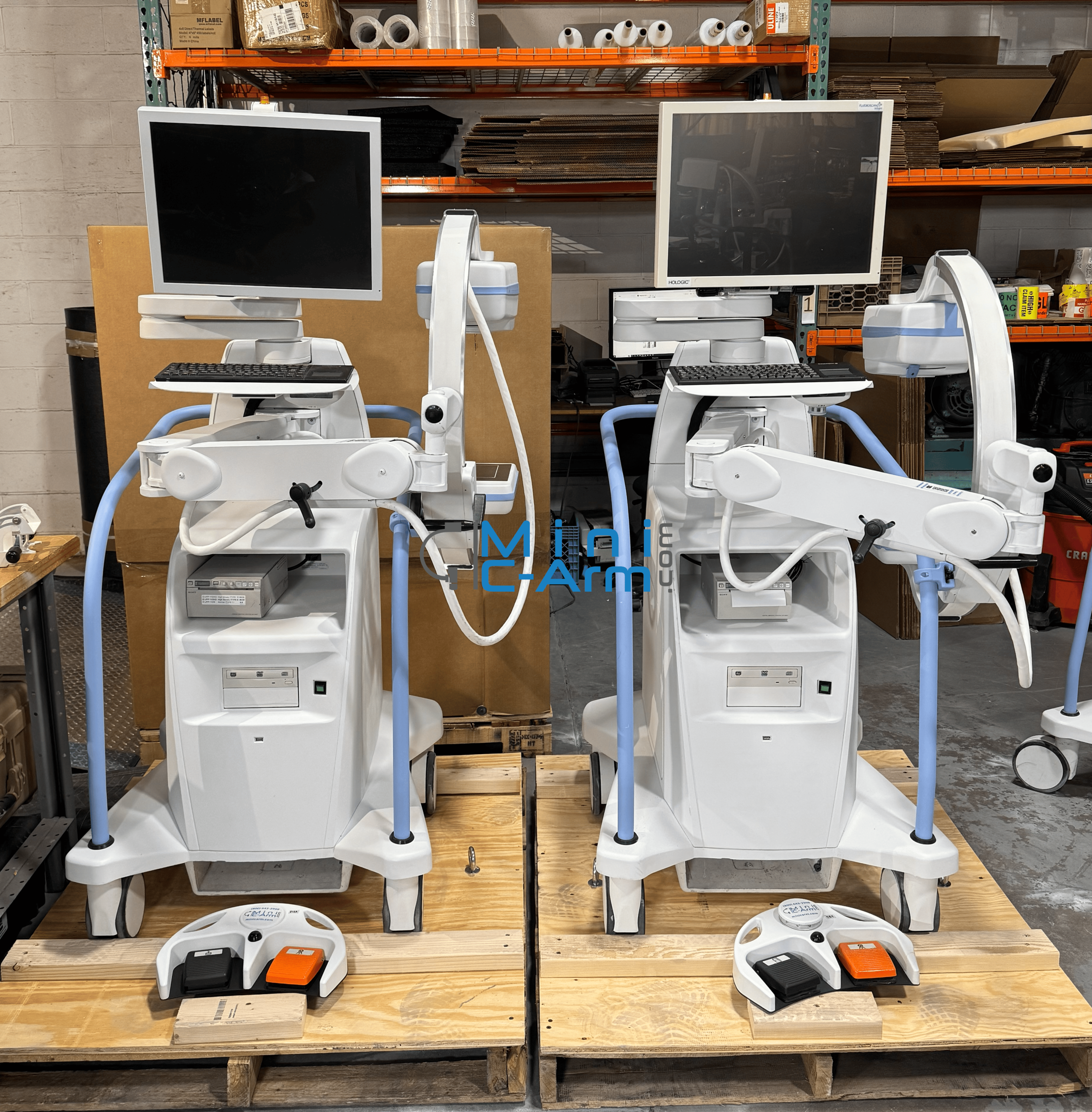A Hologic Fluoroscan InSight FD Mini C-Arm and an Orthoscan Mobile DI are being prepped for shipment to their new homes.